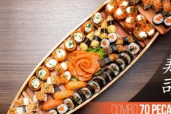 Combinado com 12 Sashimi, 5 Joe Salmão, 2 Joe Pepino, 3 Joe Camarão, 6 Niguiri, 6 Niguiri Skin, 8 Hossomaki, 8 Uramaki, 8 Hot PhiladenfiaCombo Tsunami 70 peças