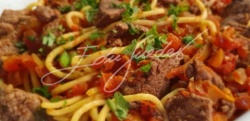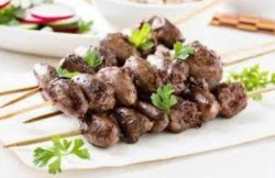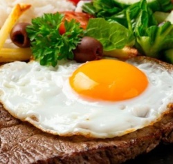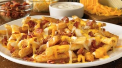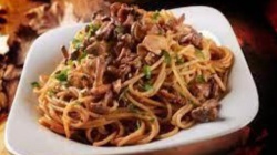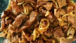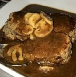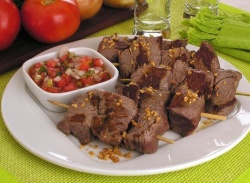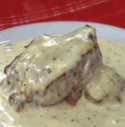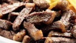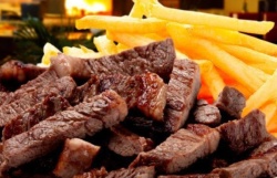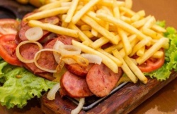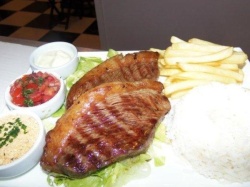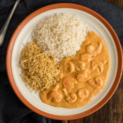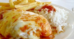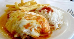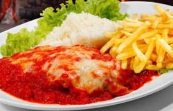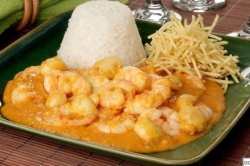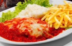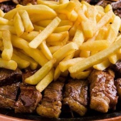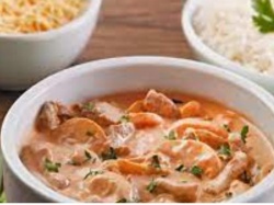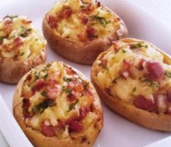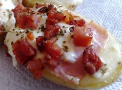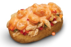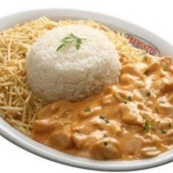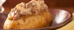 Batata grande assada e recheada com estrogonofe que pode ser de frango ou carne