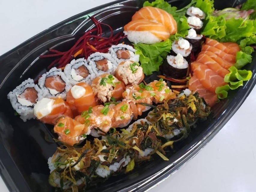 Combinado com 7 Sashimi, 8 Joe Salmão, 6 Niguiri, 8 Hossomaki, 8 Uramaki, 8 Hot Philadelfi